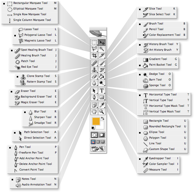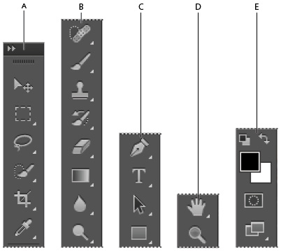 В каждой группе инструментов имеется инструмент, расположенный верху списка инструментов группы, он отображён на инструментальной панели и активируется по клику левой клавишей мыши, иными словами он является самым быстродоступным в группе.