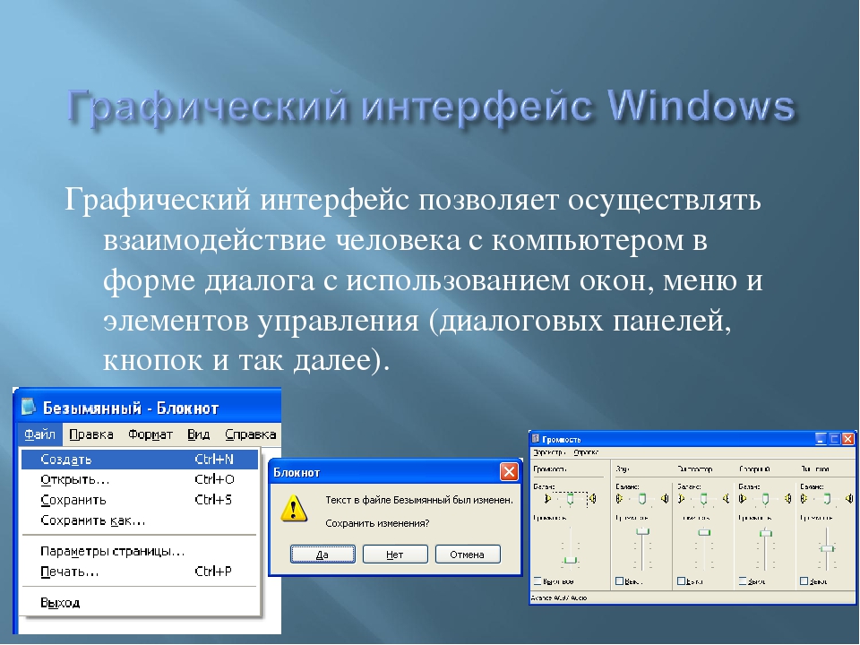 // Вычислить 16-битную гистограмму для красного, зеленого, синего и альфа-компонентов m.Выход: бин красный зеленый синий альфа 0x0000-0x0fff: 364 790 7242 0 0x1000-0x1fff: 645 2967 1039 0 0x2000-0x2fff: 1072 2299 979 0 0x3000-0x3fff: 820 2266 980 0 0x4000-0x4fff: 537 1305 541 0 0x5000-0x5fff: 319 962 261 0 0x6000-0x6fff: 322 375 177 0 0x7000-0x7fff: 601 279 214 0 0x8000-0x8fff: 3478 227 273 0 0x9000-0x9fff: 2260 234 329 0 0xa000-0xafff: 921 282 373 0 0xb000-0xbfff: 321 335 397 0 0xc000-0xcfff: 229 388 298 0 0xd000-0xdfff: 260 414 277 0 0xe000-0xefff: 516 428 298 0 0xf000-0xffff: 2785 1899 1772 15450 графический интерфейс пользователя | вычисления графический интерфейс пользователя (GUI) , компьютерная программа, которая позволяет человеку общаться с компьютером с помощью символов, визуальных метафор и указательных устройств. Ранние идеи Не было ни одного изобретателя GUI; он развивался с помощью ряда новаторов, каждый из которых улучшал работу своего предшественника.Первым теоретиком был Ванневар Буш, директор Управления научных исследований и разработок США, который в влиятельном эссе «Как мы можем думать», опубликованном в июльском номере The Atlantic Monthly за 1945 год, представил себе, как будущие сборщики информации будут использовать похожее на компьютер устройство, которое он назвал «мемексом», оснащенное кнопками и рычагами, которые могли получить доступ к огромному количеству связанных данных — идея, предвосхитившая гиперссылки. Британская викторина Викторина по компьютерам и технологиям Компьютеры размещают веб-сайты, состоящие из HTML, и отправляют текстовые сообщения, такие простые, как . ПАРК Следующая волна инноваций в графическом пользовательском интерфейсе произошла в Исследовательском центре (PARC) корпорации Xerox в Пало-Альто (Калифорния), куда в 1970-х годах переехали несколько сотрудников Энгельбарта. Новые идеи интерфейса нашли свое отражение в рабочей станции Xerox Star, которая была представлена в 1981 году. на экране компьютера была, по сути, картинка.Битовое отображение не только приветствовало использование графики, но и позволяло отображать на экране компьютера именно то, что будет напечатано на принтере — функция, которая стала известна как «что видишь, то и получаешь» или WYSIWYG. Ученые-компьютерщики из PARC, в частности Алан Кей, также разработали интерфейс Star, чтобы воплотить метафору: набор маленьких картинок или «значков» располагался на экране, который должен был восприниматься как виртуальный рабочий стол. В конце 1979 года группа инженеров Apple во главе с одним из основателей Стивеном П. Джобсом увидела графический интерфейс пользователя во время визита в PARC и была достаточно впечатлена, чтобы интегрировать идеи в два новых компьютера, Lisa и Macintosh, которые тогда находились на стадии проектирования. Каждый продукт имел растровый экран и гладкую мышь размером с ладонь (хотя для простоты использовалась одна командная кнопка, в отличие от нескольких кнопок в версиях SRI и PARC).В программном интерфейсе использовались перекрывающиеся окна, а не мозаика экрана, и использовались значки, соответствующие метафоре рабочего стола Xerox. Более того, инженеры Apple добавили свои нововведения, в том числе «строку меню», которая одним щелчком мыши опускала бы «выпадающий» список команд. В то время как Lisa впервые принесла принципы графического интерфейса на более широкий рынок, именно более дешевый Macintosh, выпущенный в 1984 году, завоевал миллионы пользователей, перешедших на этот интерфейс.Тем не менее, некоторые критики утверждали, что из-за более 