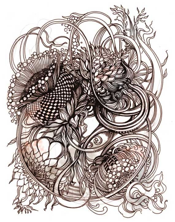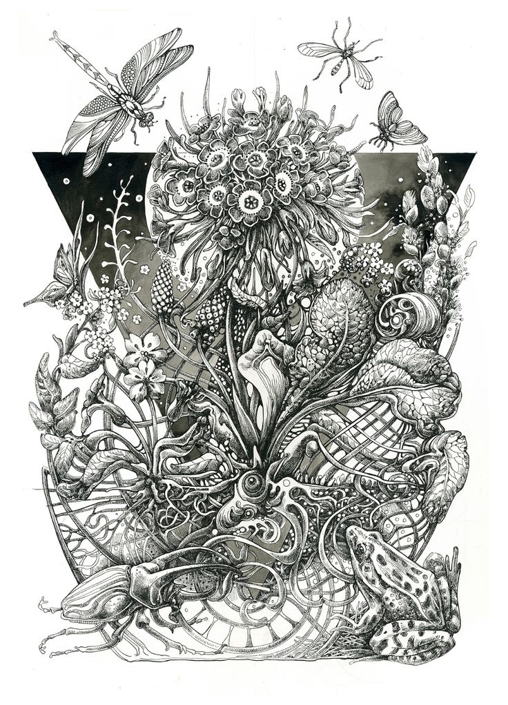 Знакомясь с Интернетом, она открыла для себя новые горизонты. Она нашла красоту, которую искала, заглянув в оцифрованные библиотеки. Ее привлекали старые книги и макросъемка насекомых и растений. Этот вихрь визуальной информации заставлял ее создавать собственные рисунки, в которых все увиденное сливалось воедино.