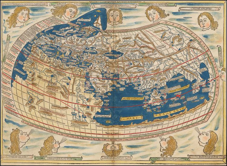 Суша на географических картах того времени изображалась в виде дискообразной суши, разделенной на три части света — Европу, Азию и Африку, которые окружались мировым океаном.