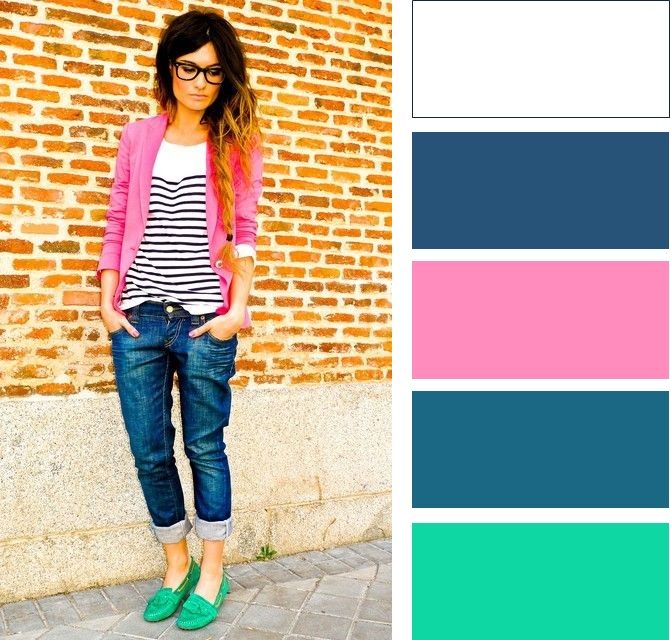 Будьте внимательны, данное цветовое сочетание подходит только для теплого и летнего времени года и в остальные прохладные сезоны смотрится слишком вызывающе и ярко. В составлении образа можно использовать равное количество цветов или же брать один из них в роли базового.