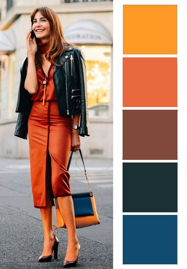 - Оранжевый – в дуэте с апельсиновыми вещами красный оживит образ и придаст ему страстности и выразительности;