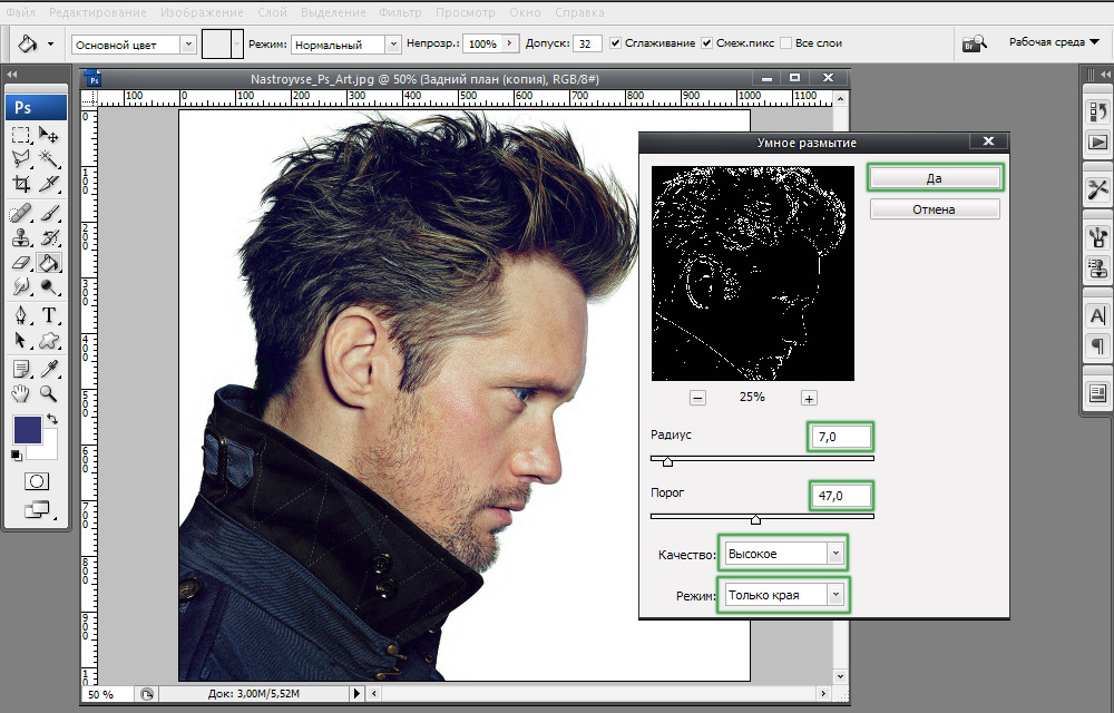 ΠΡΠ±Π»ΠΈΡΡΡ ΡΠ»ΠΎΠΈ, ΠΏΠ΅ΡΠ΅Π²ΠΎΠΆΡ ΠΎΠ΄ΠΈΠ½ ΠΈΠ· Π½ΠΈΡ Π² ΡΠ΅ΠΆΠΈΠΌ overlay, ΠΏΡΠΈΠΌΠ΅Π½ΡΡ ΡΠΈΠ»ΡΡΡ High pass, ΠΈ ΠΊΡΡΡΡ ΠΏΠΎΠ»Π·ΡΠ½ΠΎΠΊ, Π½Π°ΡΡΡΠ°ΠΈΠ²Π°Ρ Π½ΡΠΆΠ½ΡΡ ΡΠ΅Π·ΠΊΠΎΡΡΡ. Π‘ ΠΏΠΎΠΌΠΎΡΡΡ Π½Π΅Π³ΠΎ Π½Π°ΡΡΡΠ°ΠΈΠ²Π°Ρ Π³ΡΠ°Π΄ΠΈΠ΅Π½ΡΡ ΠΈ ΡΠ΅ΡΠΊΠΎΡΡΡ Π³ΡΠ°Π½Π΅ΠΉ Π² ΠΈΠ·ΠΎΠ±ΡΠ°ΠΆΠ΅Π½ΠΈΠΈ.