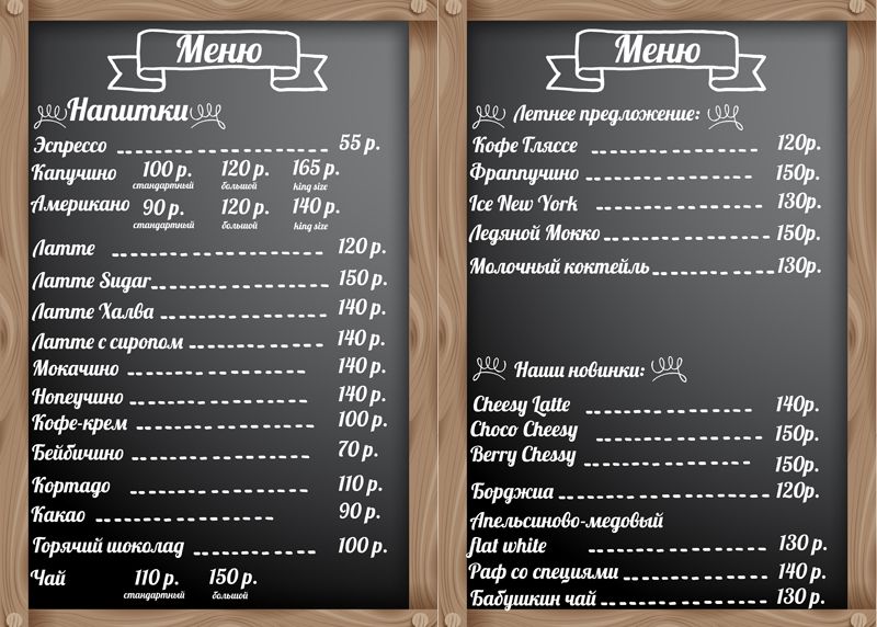 Подойдет для кофейни, бара или другого небольшого заведения. Используйте этот формат, если в меню предполагается небольшое количество позиций, они будут часто меняться, а также блюда, которые вы предлагаете всем известны. Такой формат отличается минималистичным дизайном, чтобы не перегружать и не раздражать посетителя.