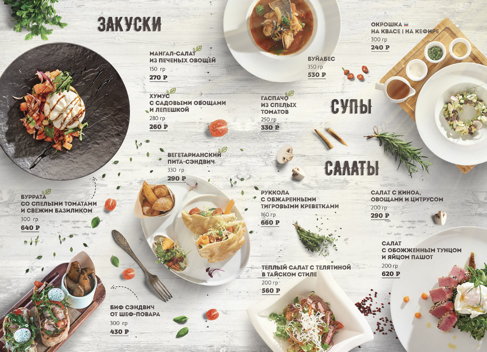 Именно поэтому, чтобы сформировать полноценный образ, все элементы заведения должны быть выдержаны в едином стиле: от интерьера до меню. Это касается материалов, фотографий, названий и описаний самих блюд. Вы можете выбрать иллюстрации и надписи для оформления стен и дублировать тот же стиль в меню.