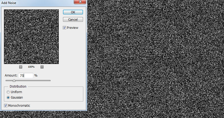 Добавьте 100% в параметре «Сумма», затем установите для параметра «Распределение» значение «Гаусс» и установите флажок «Монохроматический».