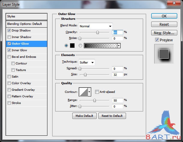 Перед нами всплывает меню со стилями слоя. Слева перечислены параметры наложения, а справа элементы. Мы работаем таким образом: