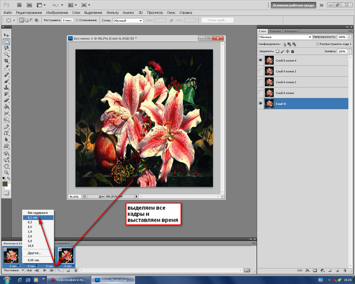 Π Π·Π°Π²Π΅ΡΡΠ΅Π½ΠΈΠ΅, ΡΡΡΠ°Π½ΠΎΠ²ΠΈΡΠ΅ Π²ΡΠ΅ΠΌΡ ΠΎΡΠΎΠ±ΡΠ°ΠΆΠ΅Π½ΠΈΡ ΠΊΠ°ΠΆΠ΄ΠΎΠ³ΠΎ ΠΊΠ°Π΄ΡΠ°. ΠΡΠ΄Π΅Π»ΠΈΡΠ΅ ΠΏΠ΅ΡΠ²ΡΠΉ ΠΊΠ°Π΄Ρ, Π° Π·Π°ΡΠ΅ΠΌ ΡΠ΅Π»ΠΊΠ½ΠΈΡΠ΅ ΠΏΠΎ ΠΏΠΎΡΠ»Π΅Π΄Π½Π΅ΠΌΡ Ρ Π·Π°ΠΆΠ°ΡΠΎΠΉ ΠΊΠ½ΠΎΠΏΠΊΠΎΠΉ Β«ShiftΒ», Π΄Π»Ρ ΡΠΎΠ³ΠΎ ΡΡΠΎΠ±Ρ Π²ΡΠ΄Π΅Π»ΠΈΡΡ ΠΈΡ Π²ΡΠ΅. Π’Π΅ΠΏΠ΅ΡΡ ΡΠ΅Π»ΠΊΠ½ΠΈΡΠ΅ ΡΡΡΠ΅Π»ΠΊΡ Π²Π½ΠΈΠ· ΠΏΠΎΠ΄ ΠΎΠ΄Π½ΠΈΠΌ ΠΈΠ· ΠΊΠ°Π΄ΡΠΎΠ² ΠΈ Π²ΡΠ±Π΅ΡΠΈΡΠ΅ Π·Π°Π΄Π΅ΡΠΆΠΊΡ. ΠΡΡΡΡΡΡΠ²ΠΈΠ΅ Π·Π°Π΄Π΅ΡΠΆΠΊΠΈ ΠΎΠ·Π½Π°ΡΠ°Π΅Ρ, ΡΡΠΎ Π°Π½ΠΈΠΌΠ°ΡΠΈΡ Π±ΡΠ΄Π΅Ρ ΡΠ°Π±ΠΎΡΠ°ΡΡ Π±ΡΡΡΡΠΎ, Π² ΡΠΎ Π²ΡΠ΅ΠΌΡ ΠΊΠ°ΠΊ ΡΡΡΠ°Π½ΠΎΠ²Π»Π΅Π½Π½ΠΎΠ΅ ΠΊΠΎΠ»ΠΈΡΠ΅ΡΡΠ²ΠΎ ΡΠ΅ΠΊΡΠ½Π΄ Π·Π°ΡΡΠ°Π²ΠΈΡ ΠΊΠ°Π΄ΡΡ ΠΎΡΡΠ°Π²Π°ΡΡΡΡ Π½Π° ΡΠΊΡΠ°Π½Π΅ Π² ΡΠ΅ΡΠ΅Π½ΠΈΠ΅ Π·Π°Π΄Π°Π½Π½ΠΎΠ³ΠΎ ΠΏΠ΅ΡΠΈΠΎΠ΄Π° Π²ΡΠ΅ΠΌΠ΅Π½ΠΈ.