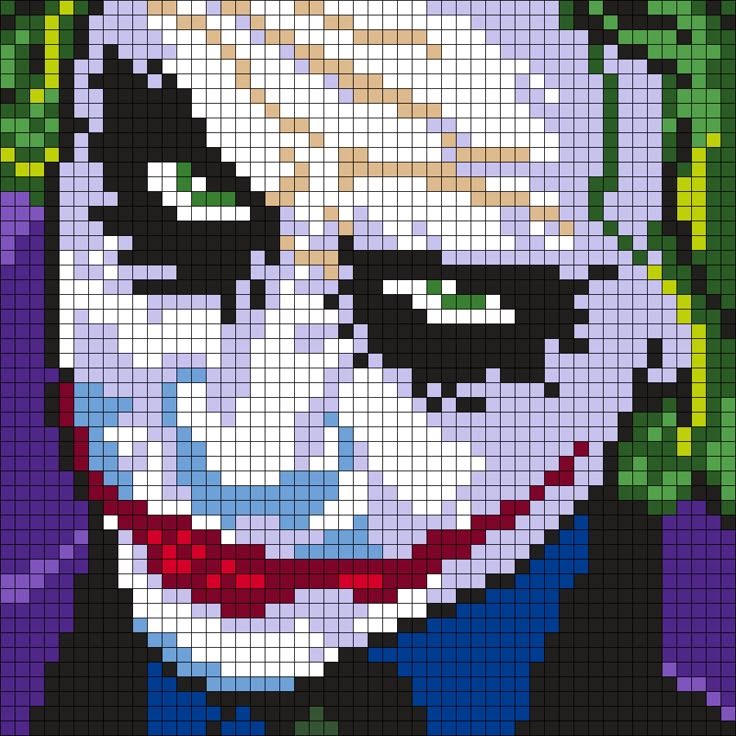 В этом пиксельном арте Minecraft у нас есть Джокер из вселенной Бэтмена. Известный злодей в этой вселенной. Его цветовая гамма варьируется от нескольких оттенков зеленого, красного, фиолетового, белого и синего.