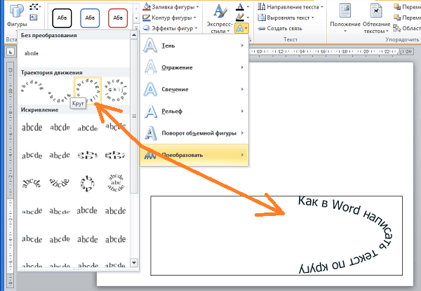 Выделите блок с надписью и снова откройте «Средства рисования» — «Формат» . Здесь в группе «Стили WordArt» нажмите на кнопку «Текстовые эффекты» , откроется список, из которого выберите «Преобразовать» — «Круг» .