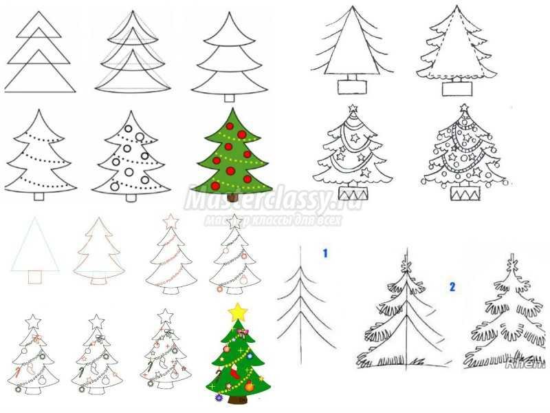 При помощи вспомогательных линий вырисовываем контур каждой елочки.