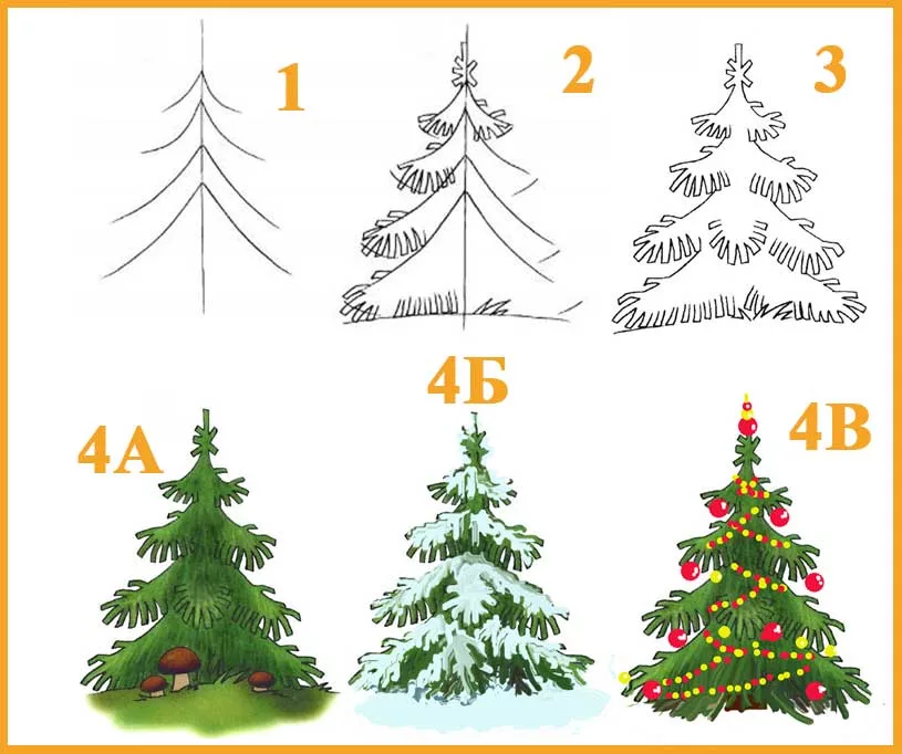 Шаг за шагом нарисуем вечнозеленую лесную красавицу на своем листе, которую называют елочкой.