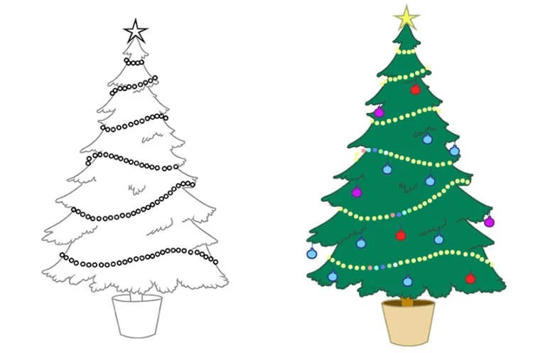 Пошаговая инструкция, как нарисовать новогоднюю елочку в игрушках и гирляндах в детский сад