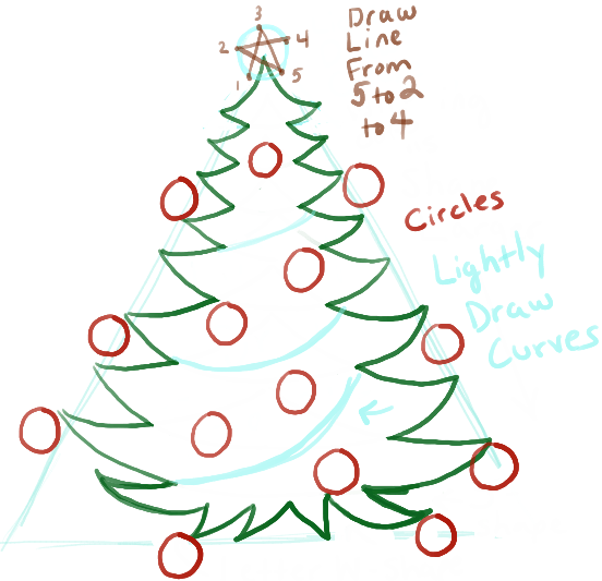 - Теперь можно изобразить на верхушке звезду, набросать контур гирлянды и основные украшения.