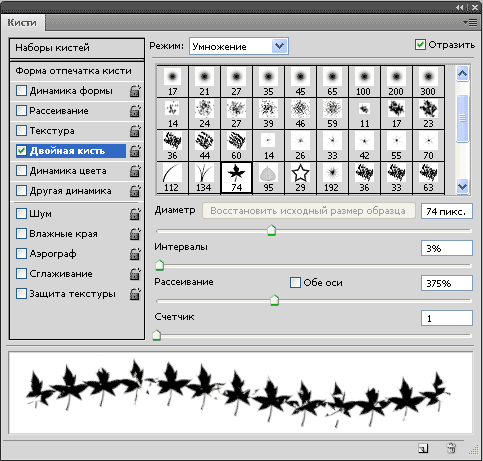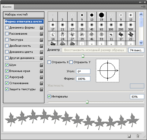 Форму же кисти можно выбрать, вызвав окно настроек благодаря горячей клавише F5. Выбор немал, поэтому вы обязательно найдете то, что удовлетворит ваши потребности.