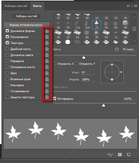 Благодаря параметрам на скриншоте выше можно разбавить кисть различными узорами и рельефом. Просто экспериментируйте, передвигая ползунки “Шкала”, “Яркость” и “Контрастность”, а также отрегулируйте “Глубину” и “Колебание глубины”.