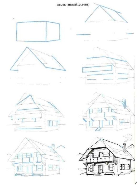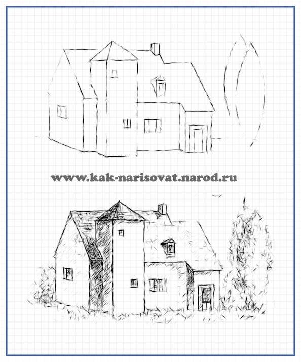 Уже начинает напоминать нашу конечную цель, не так ли? Если у вас похоже, то вы на верном пути и у вас точно получится нарисовать дом поэтапно карандашом.