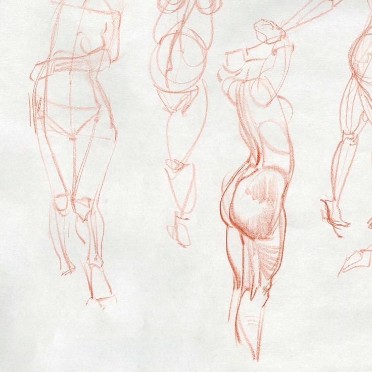 Продолжая линии туловища, изобразите широкие бедра, которые сужены в коленях, а затем немного расширены в области икроножных мышц.