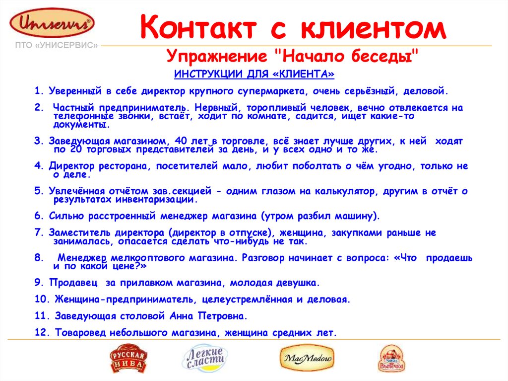 Успешная постановка складывается не только из мастерства исполнителя, но и из декораций, музыки, освещения сцены. Порой клиент может упустить важную деталь, которая повлияет на исход переговоров. Будьте внимательны. Уточняйте даже самые незначительные, на первый взгляд, моменты.
