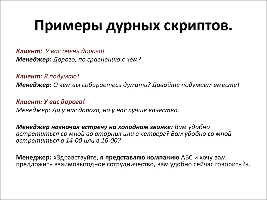 Вы — дирижер. Вы ведете за собой собеседника, направляете разговор. Вы «от и до» знаете свое произведение — товар или услугу. Тон спокойный, голос размеренный. Так вы настроите клиента на сотрудничество, очаруете его. Постоянно тренируйтесь. Нервозность в голосе передается и собеседнику. Только многократные повторения делают из новичка профессионала. Используйте скрипт как основу, но и импровизировать не забывайте.