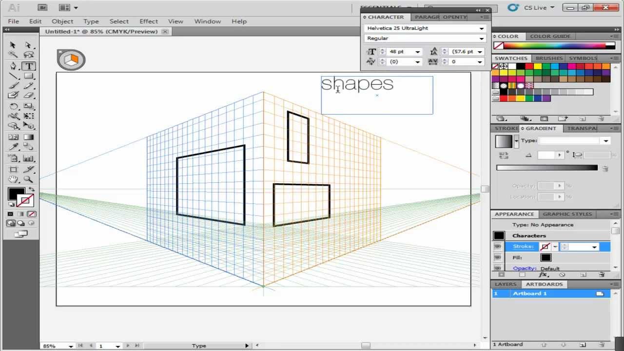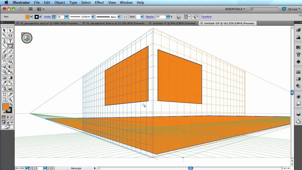 Один очень полезный метод состоит в том, чтобы использовать перспективную сетку, которая появилась в Illustrator CS5. Установление горизонта и точки схода является частью этого процесса. Сетку можно редактировать, таким образом она может быть настроена так, чтобы вы могли изменить перспективу просто при перемещении угловых узлов сетки.