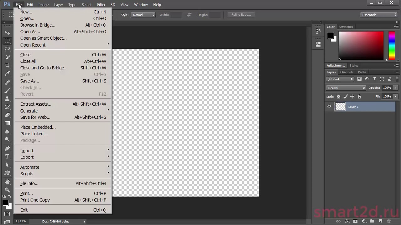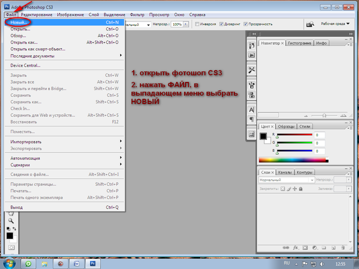 - Откройте новый документ, перейдя к Файл — Новый в строке меню