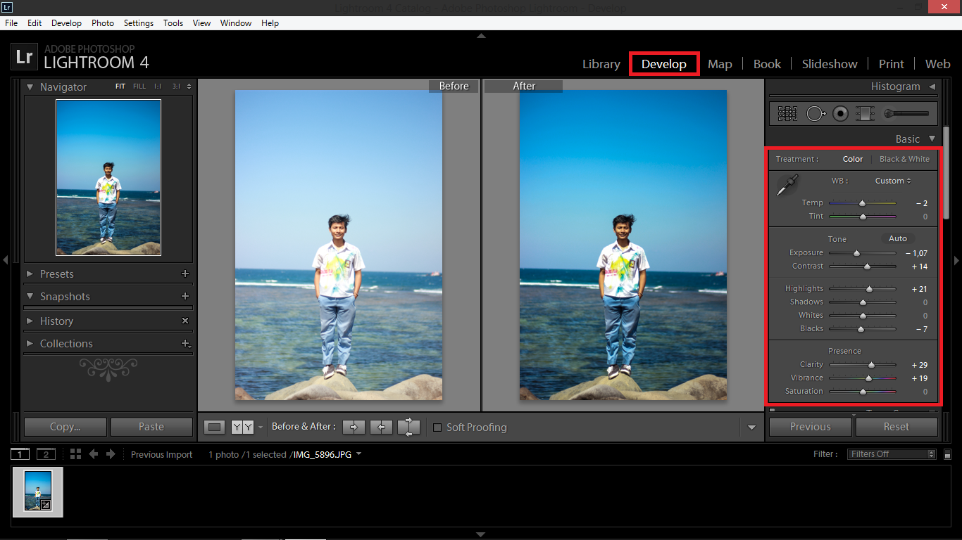 Выбираем фотографию, которую нам нужно обработать, и переходим в пункт Develop (обработка).