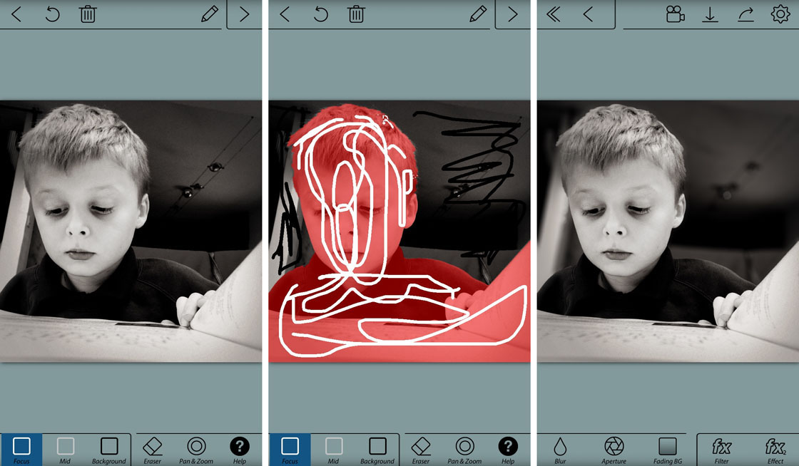 Simply draw some lines inside a focus area and the background, then AfterFocus will automatically recognize the focus area. You can also select the area with traditional finger painting.
