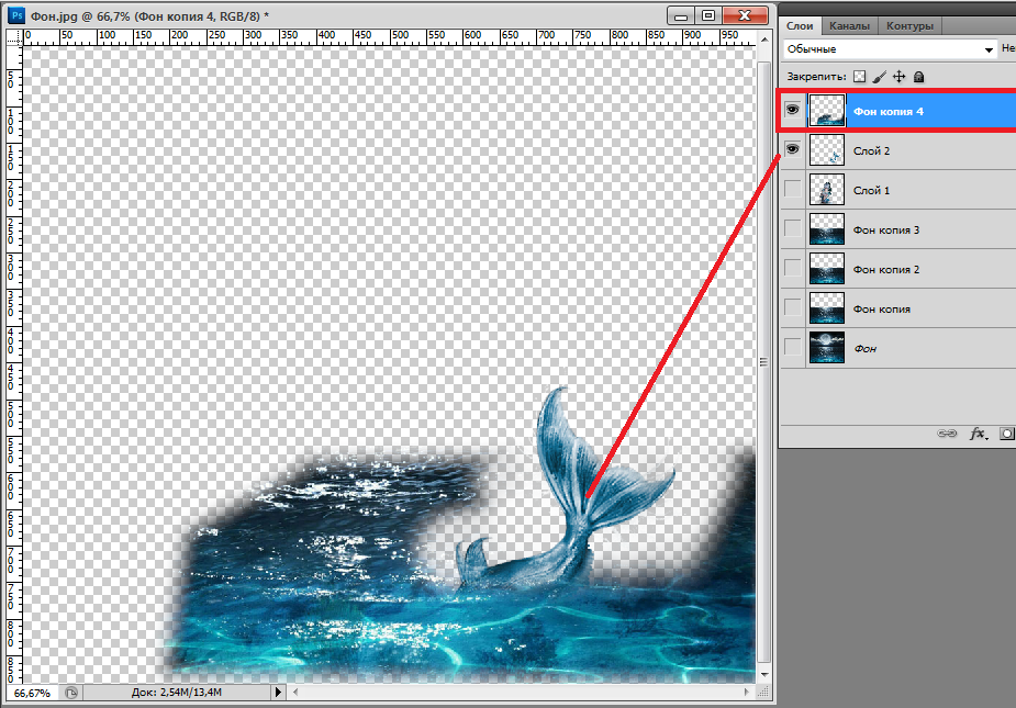 9. Переносим картинку при помощи черной стрелочки на рабочую зону, где имеется вырезанный объект. По надобности увеличиваем или уменьшаем размер фона, нажимая комбинацию клавиш Ctrl+T.