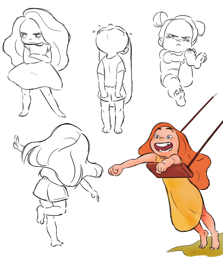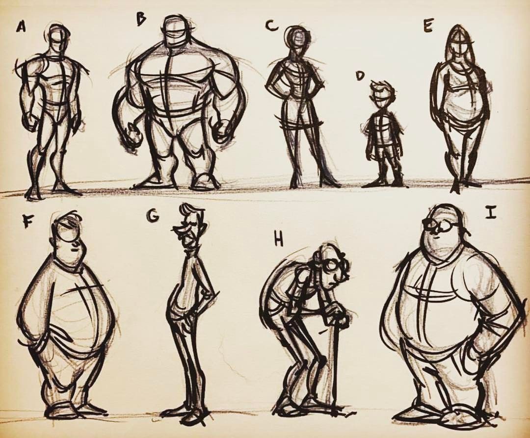 Некоторые художники также предпочитают рисовать персонажей размером с ноготь и делать несколько вариаций на одном и том же холсте, сосредотачиваясь на основных формах и жестах. Разнообразие — это то, что может помочь вам принять решение о том, с какого угла камеры вы снимаете и что лучше всего рассказывает историю.