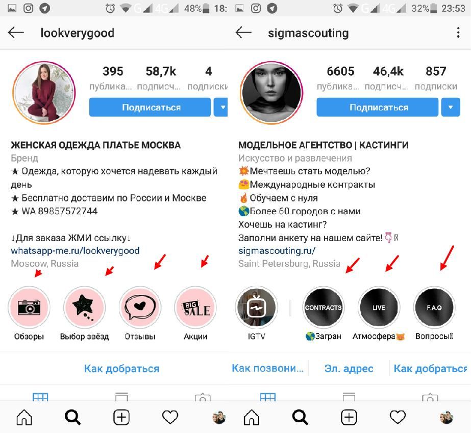 - закрепленные сторис — хайлайтс — в них можно описать кейсы, актуальные цены и другую дополнительную информацию;
