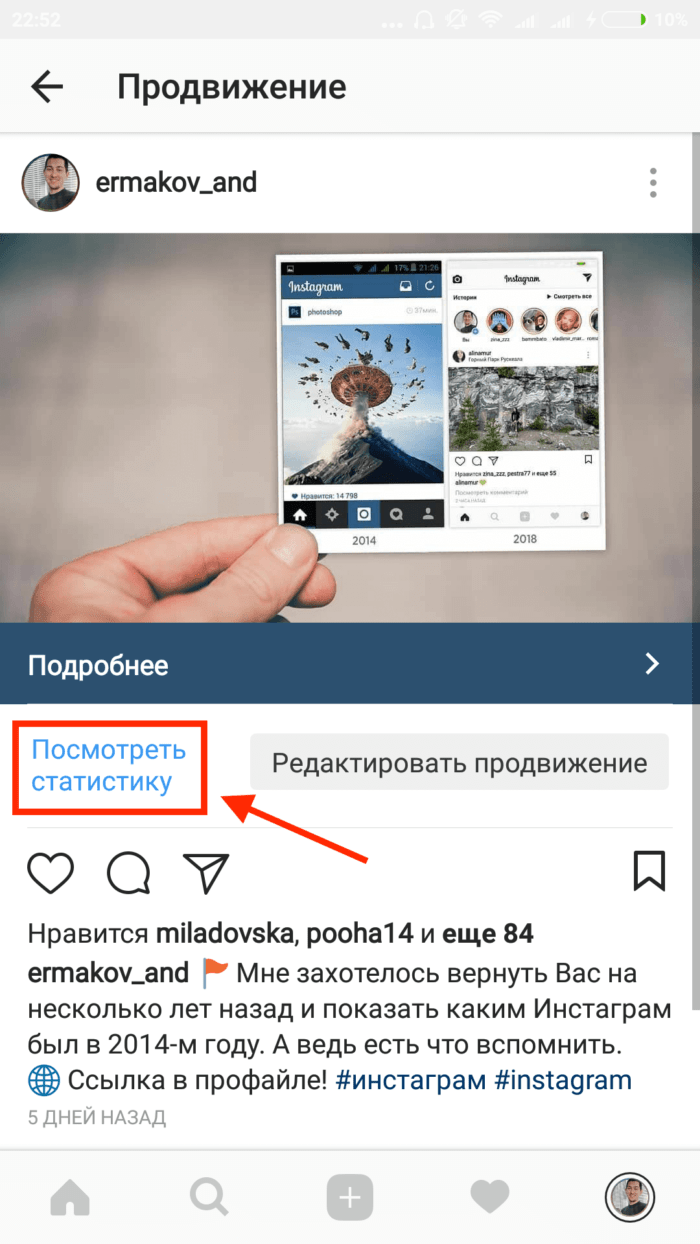 Когда вы должным образом настроили аккаунт, у вас откроется возможность настройки рекламной кампании в инстаграм из мобильного приложения. Чтобы рекламировать конкретный пост, нажмите кнопку «Продвигать» под нужным постом.