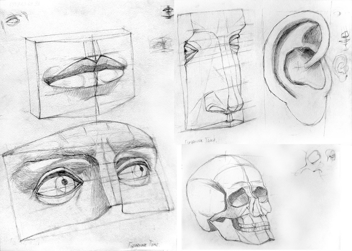 Чтобы научиться рисовать портрет, нужно научиться рисовать карандашом с натуры гипсовые предметы — шар и куб. После научиться рисовать череп, гипсовую обрубовку, гипсовые части лица: нос, ухо, глаз.