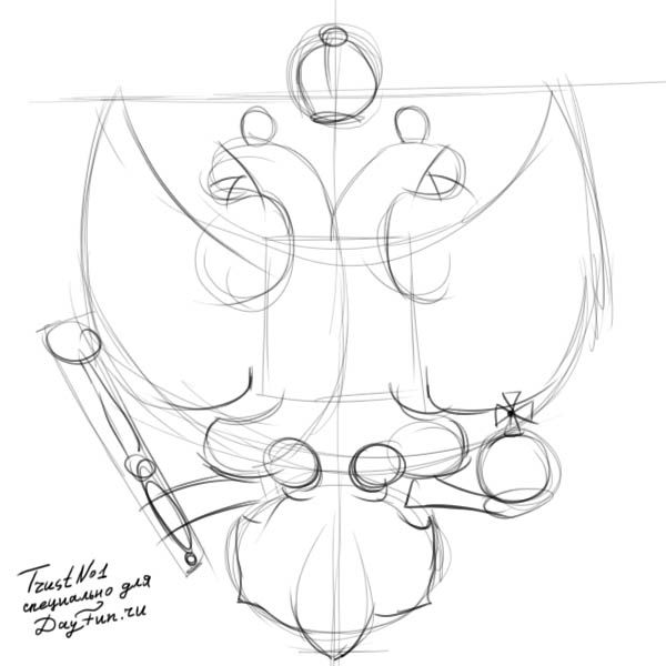- С помощью простого карандаша сделайте набросок. Вначале нарисуйте форму герба и его основные элементы, затем фигуры и вспомогательные элементы
