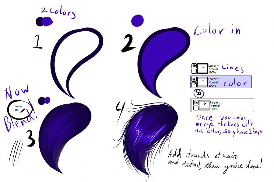 Этим же инструментом создайте блики на волосах. Слегка подотрите их и размойте. Челку можно осветлить к концам цветом кожи. Также карандашом дорисуйте несколько прядей.