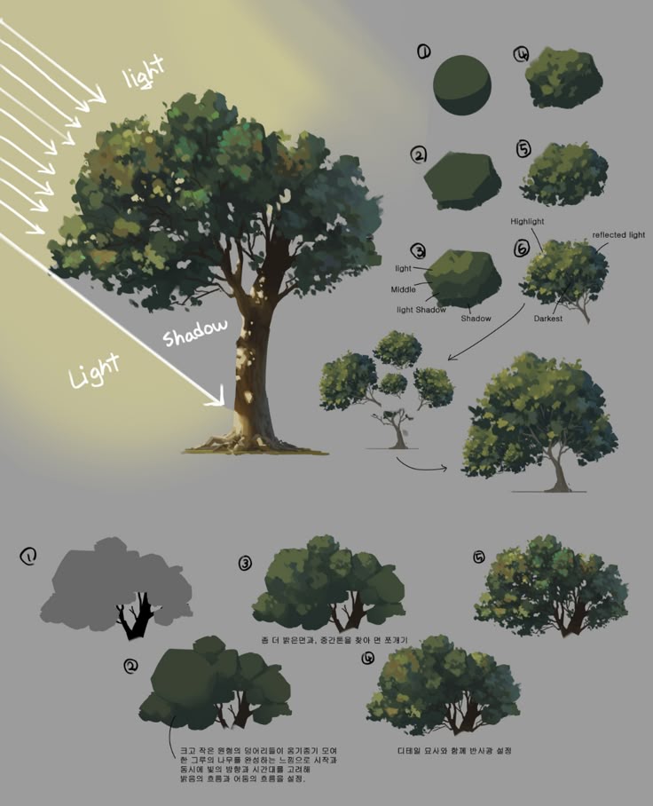 Такой способ рисования является весьма практичным, ведь его можно использовать как при рисование крупных изображений, так при дополнении большой картины мелкими деталями. Яркость и свечение травы могут меняться в зависимости от времени суток и расположения источника света. В целом такая техника хорошо подойдет тем, кто только начал познавать тернистый путь рисования.