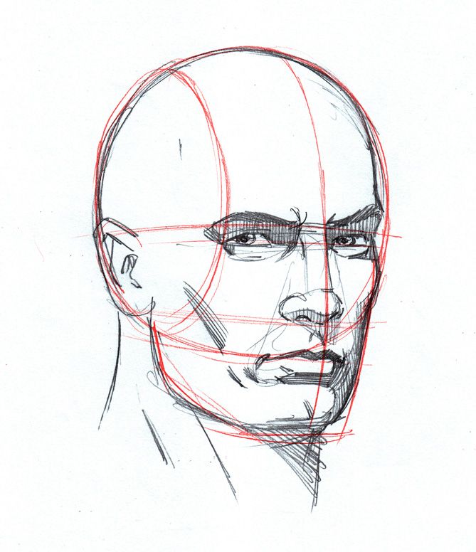 Нарисуйте сферу, которая находится на центральной линии, размещение будет зависеть от того, смотрит ли голова прямо вперед или в сторону. Чем больше голова поворачивается в сторону, тем больше эта сфера будет сидеть на краю линии, если голова смотрит прямо вперед, центральная линия будет рассекать сферу через центр.Нижняя плоскость: Определите нижнюю часть носа, нарисовав изогнутый прямоугольник.