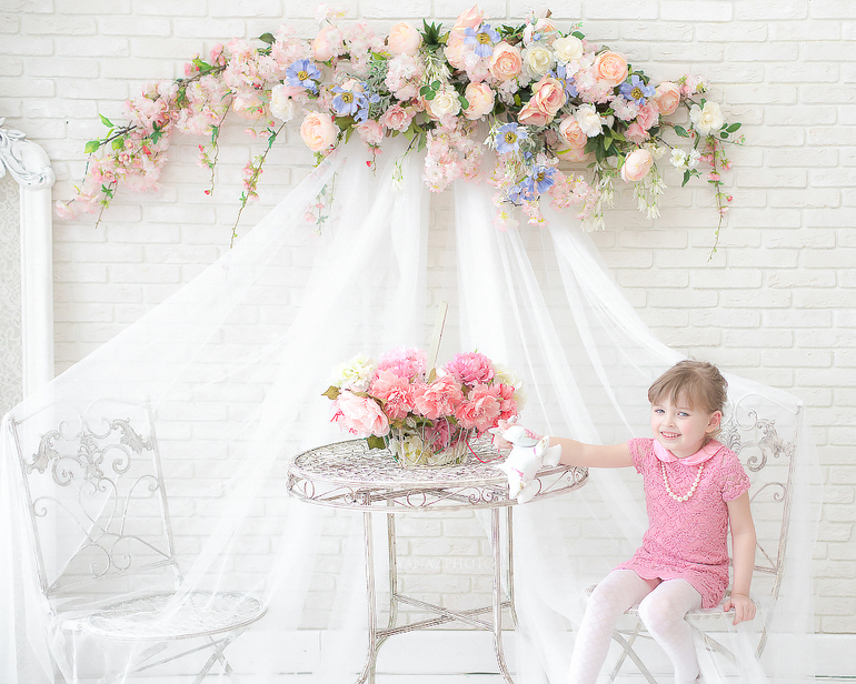 Разложите на полу несколько толстых белых/светлых простыней, завершив их кружевным материалом. Положите на него ребенка и нажмите кнопку! 6. Фон из воздушных шаров
