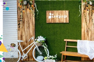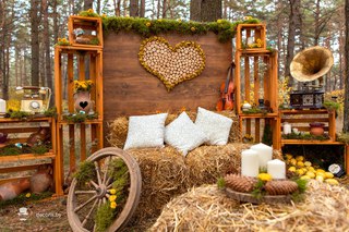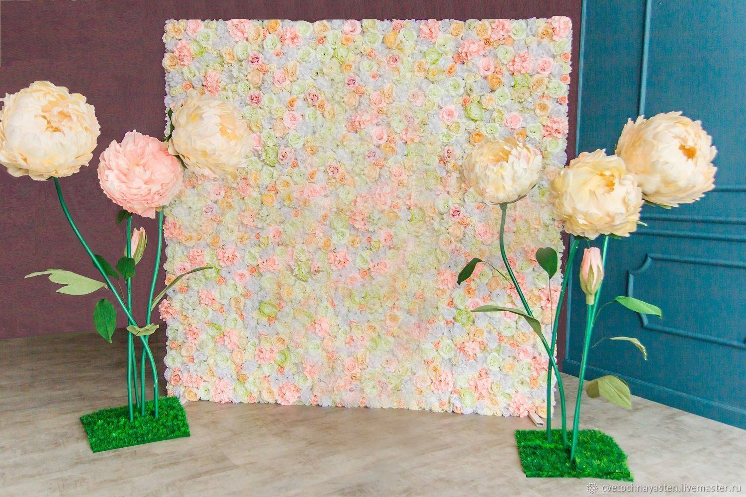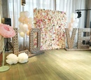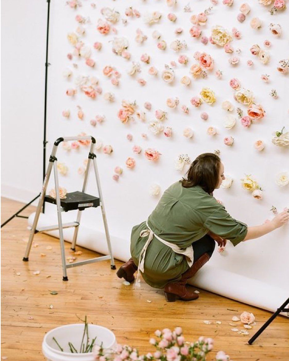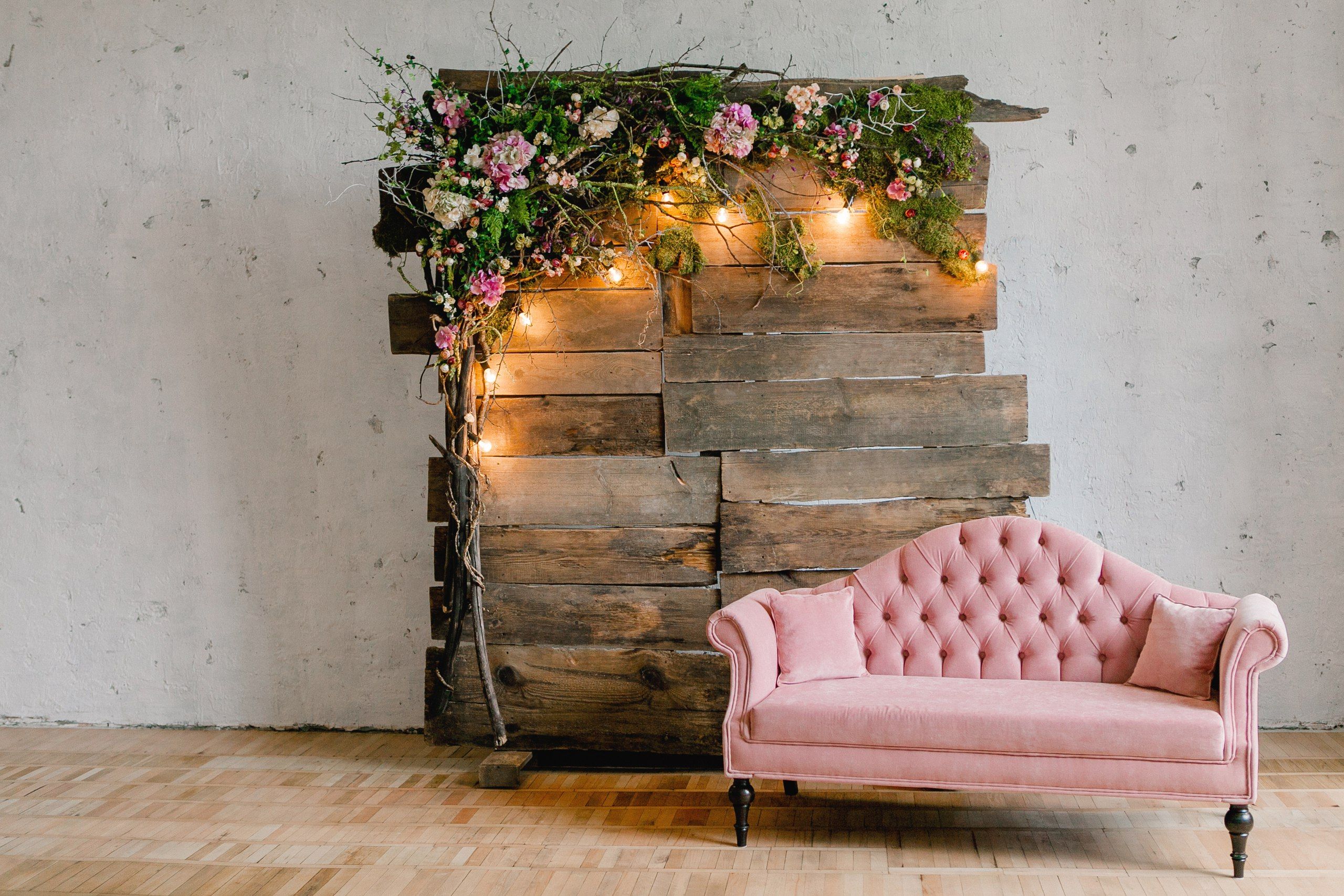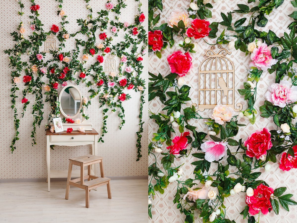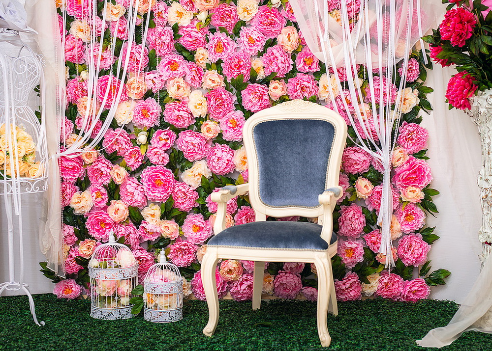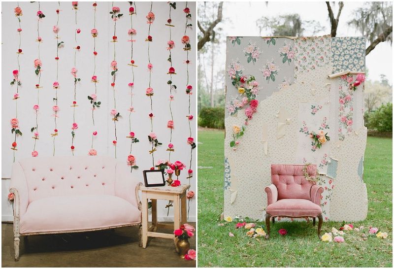 - Цветы и мох придают нежность дизайну фона для фотобудки, сделанного своими руками.