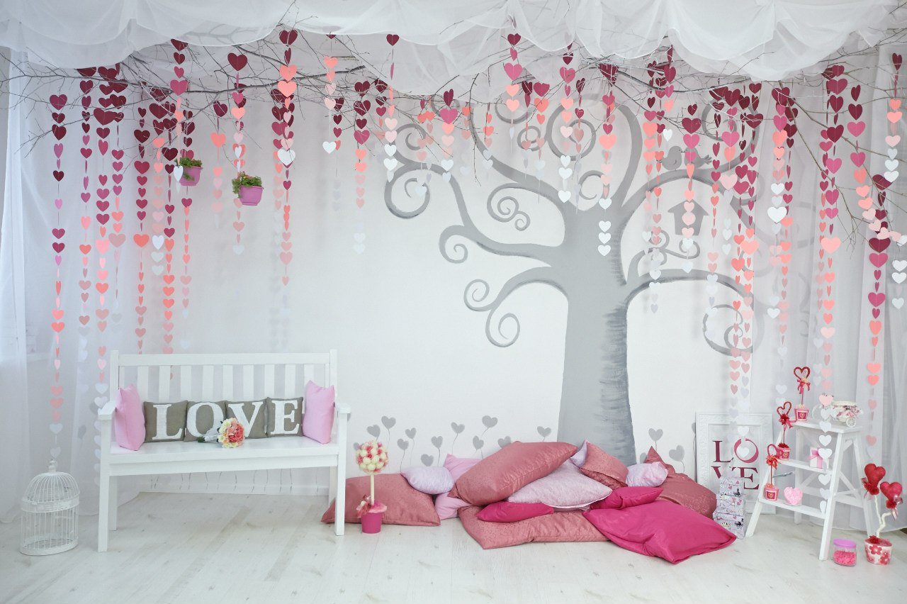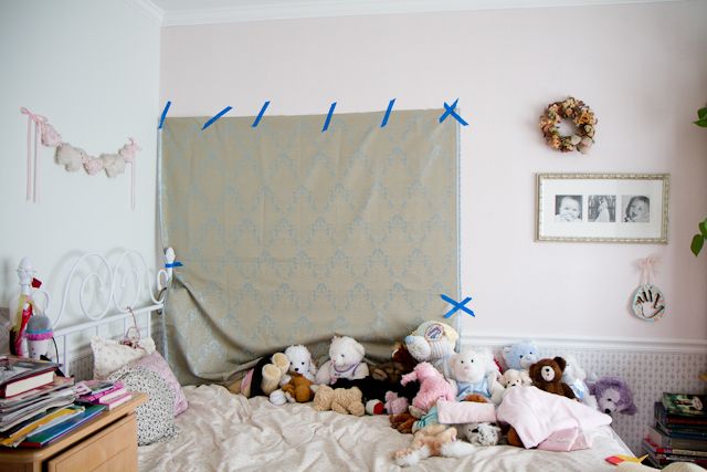 Наклейте ленты разного цвета на стену так, чтобы текущая лента немного перекрывала предыдущую. Другой вариант — наклеить ленты в плетеную клетку и приклеить их скотчем. Вы также можете придерживаться только одного цвета, если хотите немного утонченности. 4. Сказочный фон