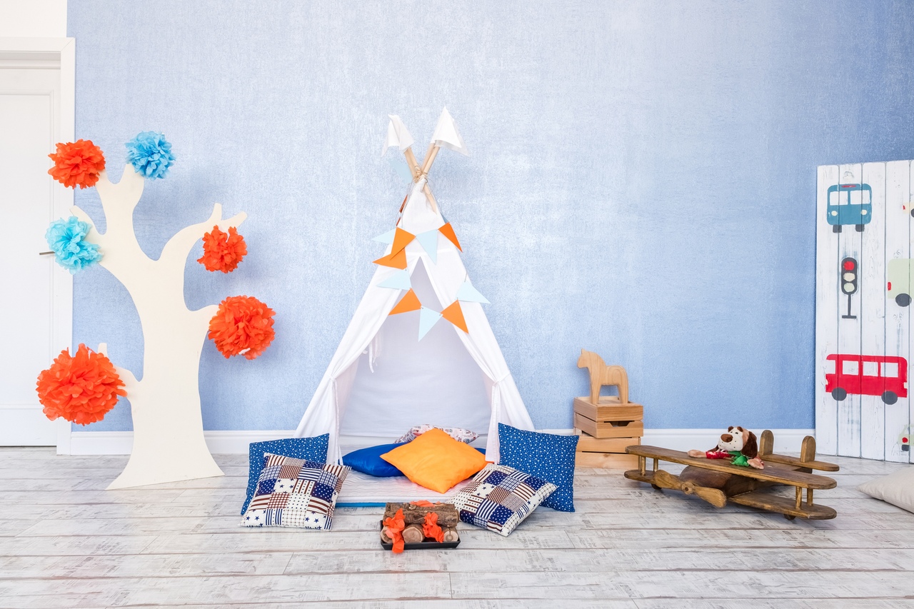 Расстелите на полу яркую простыню, поставьте на нее открытый чемодан и дайте малышу посидеть или полежать в нем. Это делает несколько очень забавных фотографий, особенно если вы сами любитель путешествий! 13. Фон для вигвама
