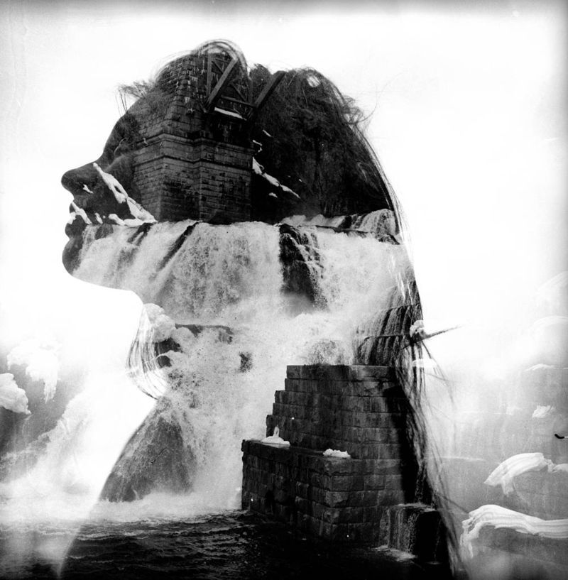 Первым был снят пейзаж и замер по светлым участкам, а портрет был снят вторым и замер по тону кожи. Так как равномерно экспонированные тона кожи перекрываются с темными тенями первого снимка, портрет выглядит очень хорошо. Если вы хотите увидеть черты лица на портрете с двойной экспозицией, вы должны равномерно выставить тон кожи и перекрыть его темной частью первой экспозиции.