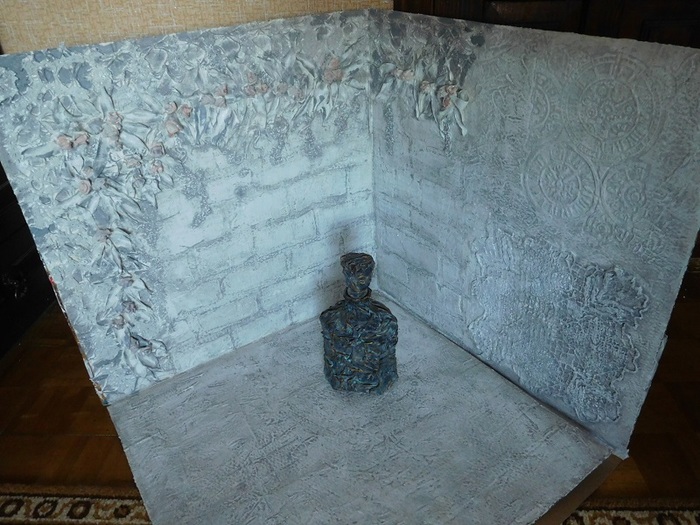 Понадобится фанера, штукатурка, краситель и шпатель. Окрашиваем штукатурку красителем и наносим на фанеру. Движения должны быть хаотичны, но текстура должна просматривать-ся. Даем высохнуть и фон готов.