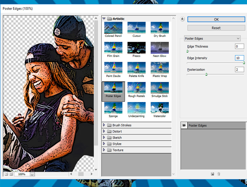 #2. Apply Poster Edges FilterТеперь мы перейдем к Filter> Filter Gallery и выберите фильтр «Край плаката» в разделе « Художественный». ” Он поставляется с тремя ползунками.
