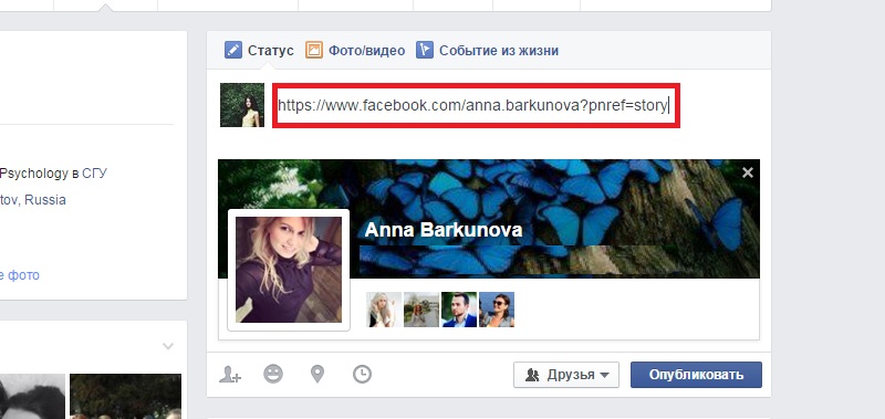 Ссылку на свою страницу Facebook необходимо скопировать и вставить в поле статуса.