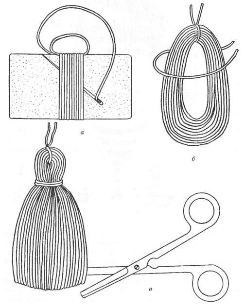 Поводов для лишних телодвижений при изготовлении самой кисточки вроде бы и нет. Но это «вроде» лишь до тех пор, пока вам не понадобится кисть определённой величины, пышности, размера, цвета и, что тоже архи важно, из ниток той же фактуры, что и основное изделие. Вот тут и появляется необходимость сделать кисть самостоятельно, именно ту, что нужна здесь и сейчас.