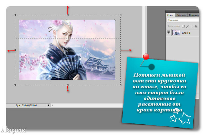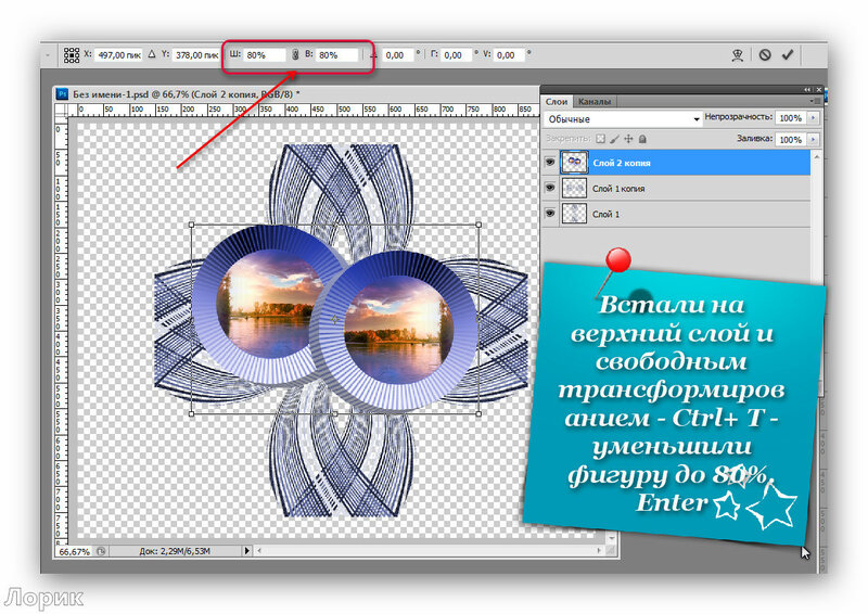 Далее выделяю область с надписью и рамкой с помощью команды «Прямоугольная область» и вызываю в меню правой кнопки инструмент «Свободное трансформирование». Пока область остается выделенной ее можно сжимать/растягивать, менять ее угол наклона, увеличивать/ уменьшать, менять ее положение. Наконец, выбираю понравившийся угол и положение надписи.