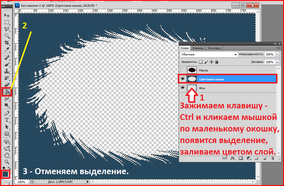 Аналогичным образом делаем внутри получившегося прямоугольника еще одну прямоугольную выделенную область, только вместо заливки нажимаем Delete — внутренняя область становится прозрачной.