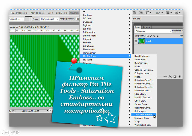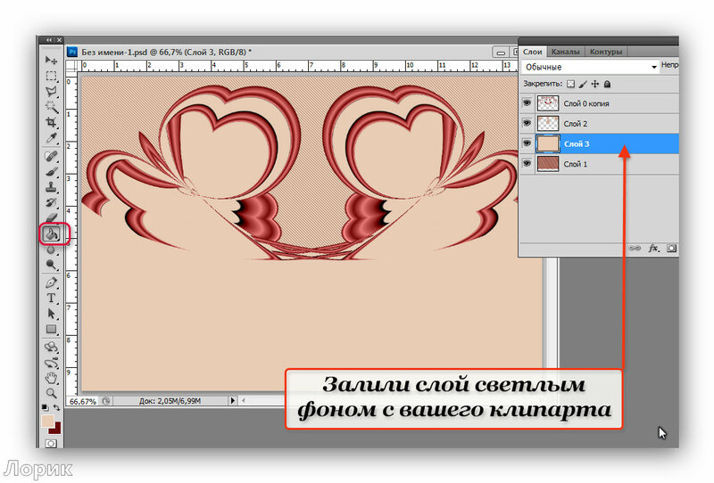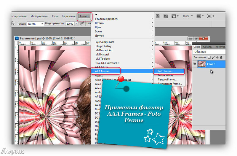 Тут надо сделать небольшое отступление: для тех, у кого Photoshop версии CS5 и более ранней, необходимо под рамку подложить слой с каким-нибудь цветом, например, белым и объединить слой с цветом и слой с рамкой, тогда фильтр сработает. После того, как вы закончите работу над рамкой, белый слой будет нетрудно удалить, воспользовавшись инструментом «Волшебный ластик» — в нашем случае необходимо щелкнуть этим инструментом внутри и снаружи получившейся рамочки по белому фону.