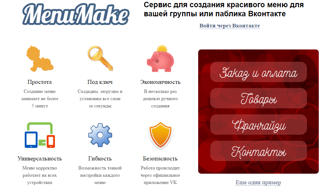 | Меню располагается в отдельной вкладке в блоке с описанием, в котором дана информация об организации или группе. Изначально оно скрыто. | Меню можно расположить в закрепленной записи, которая по умолчанию будет показываться всем подписчикам |